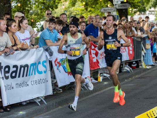 Bei sommerlichen Temperaturen legte das Spitzenduo ein enormes Tempo vor. Beim ersten Durchlauf im Zielbereich nach 5 km schnellte das Stimmungsbarometer kräftig nach oben, als Tareq und Stützel im Windschatten und mit einer Durchgangszeit von 15:02 auf das zweite Teilstück gingen – ein neuer Streckenrekord schien in greifbarer Nähe. In der Frauenkonkurrenz lief die mehrfache deutsche Vizemeisterin und Marathon-Topläuferin Melina Wolf vom Start weg ein Rennen gegen die Uhr. Nach fünf Kilometern hatte sie bereits 1:17 Minuten Vorsprung zwischen sich und Verfolgerin Valerie Moser vom Running Team Ortenau gelegt. Mit großer Spannung verfolgten die Besucher die Informationen und neuen Zwischenstände von Streckensprecher Sebastian Gehring. Nach sechs Kilometer konnte Simon Stützel dem enormen Tempo von Omar Tareq nicht mehr Schritt halten und musste etwas abreißen lassen – 2022 war es genau umgekehrt. „Das Tempo war extrem hoch und ich habe gemerkt, dass ich etwas rausnehmen muss“, so Stützel im Rückblick nach dem Lauf. Getragen von der lautstarken Kulisse stürmte Omar Tareq in Richtung Ziel – den neuen Streckenrekord stets vor Augen. Die bisherige Bestmarke von Simon Stützel unterbot er um 17 Sekunden und durfte sich im Ziel in einer Endzeit von 30:24 feiern lassen. Damit war der Sieger des Freiburg-Marathons 2025 vier Sekunden schneller als bei seiner im Februar in Payerne aufgestellten persönlichen Bestzeit über die 10 km auf der Straße.