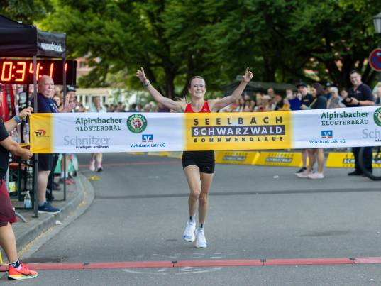 Der Jubel über den Rekordlauf von Omar Tareq war noch nicht richtig verhallt, da eilte Melina Wolf mit schnellen Beinen in Richtung Ziel. Und auch sie brannte eine neue Sonnwendlauf-Bestzeit in den Asphalt, pulverisierte den zehn Jahre alten Rekord von Svenja Abel um 38 Sekunden und steht nun mit ihrer Endzeit von 34:11 auf der Sonnwendlauf-Rekordtafel. Die sympathische Athletin der LG Region Karlsruhe verteilte nach dem Zieleinlauf einige Komplimente. „Es war ein richtig tolles Erlebnis, hier in Seelbach bei dieser super Stimmung und Organisation zu laufen. An der gesamten Strecke haben die Zuschauer uns Läufer angefeuert. Wenn man sieht, was gerade hier im Zielbereich los ist – das ist spitze und macht riesig Spaß.“ Ihr Teamkollege Simon Stützel ergänzte: „Was hier in Seelbach geschaffen wurde und wie der ganze Ort mitfeiert, ist etwas ganz, ganz Besonderes. Ich war schon bei vielen Läufen am Start, aber so etwas wie beim Sonnwendlauf erlebt man deutschlandweit in dieser Form nur ganz selten. Wir sind schon richtige Fans geworden und freuen uns, ein Teil des Sonnwendlaufs zu sein.“